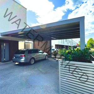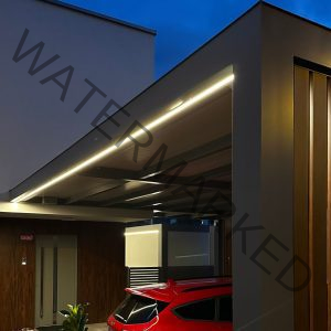 Nadstrešek je izdelan iz visoko kakovostne aluminijaste in inox konstrukcije, kar zagotavlja trpežnost, dolgo življenjsko dobo in minimalno vzdrževanje. Posebnost tega nadstreška je njegova velikost – kar 6 x 7 metrov brez vmesnih ojačitev ali podpornih stebrov, kar omogoča čista, odprta linija nad vozili in elegantna, moderna estetika. To je mogoče prav zaradi uporabe aluminija, ki je lahek, a izredno trpežen material, z odličnimi konstrukcijskimi lastnostmi. Prilagodili smo se tudi arhitekturni situaciji – zaobjeli smo vogal hiše – ter tako dosegli brezhibno vpetost v obstoječo strukturo.